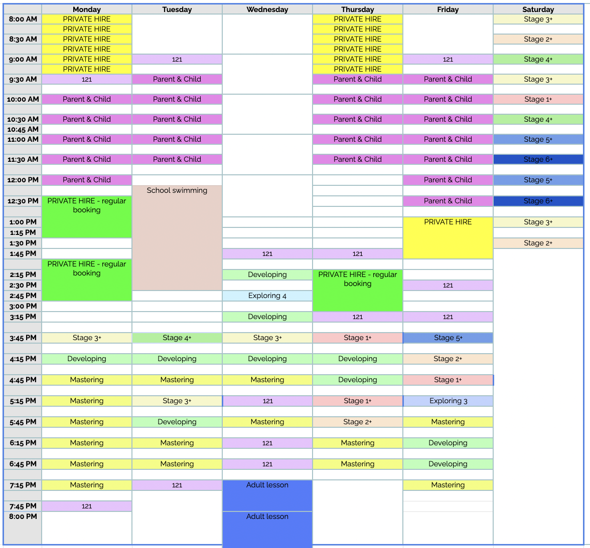 We are not a large leisure centre. We focus on quality not quantity. We run small lessons, with only 1 class going on at one time, as we believe this is the best way to help swimmers focus and progress.